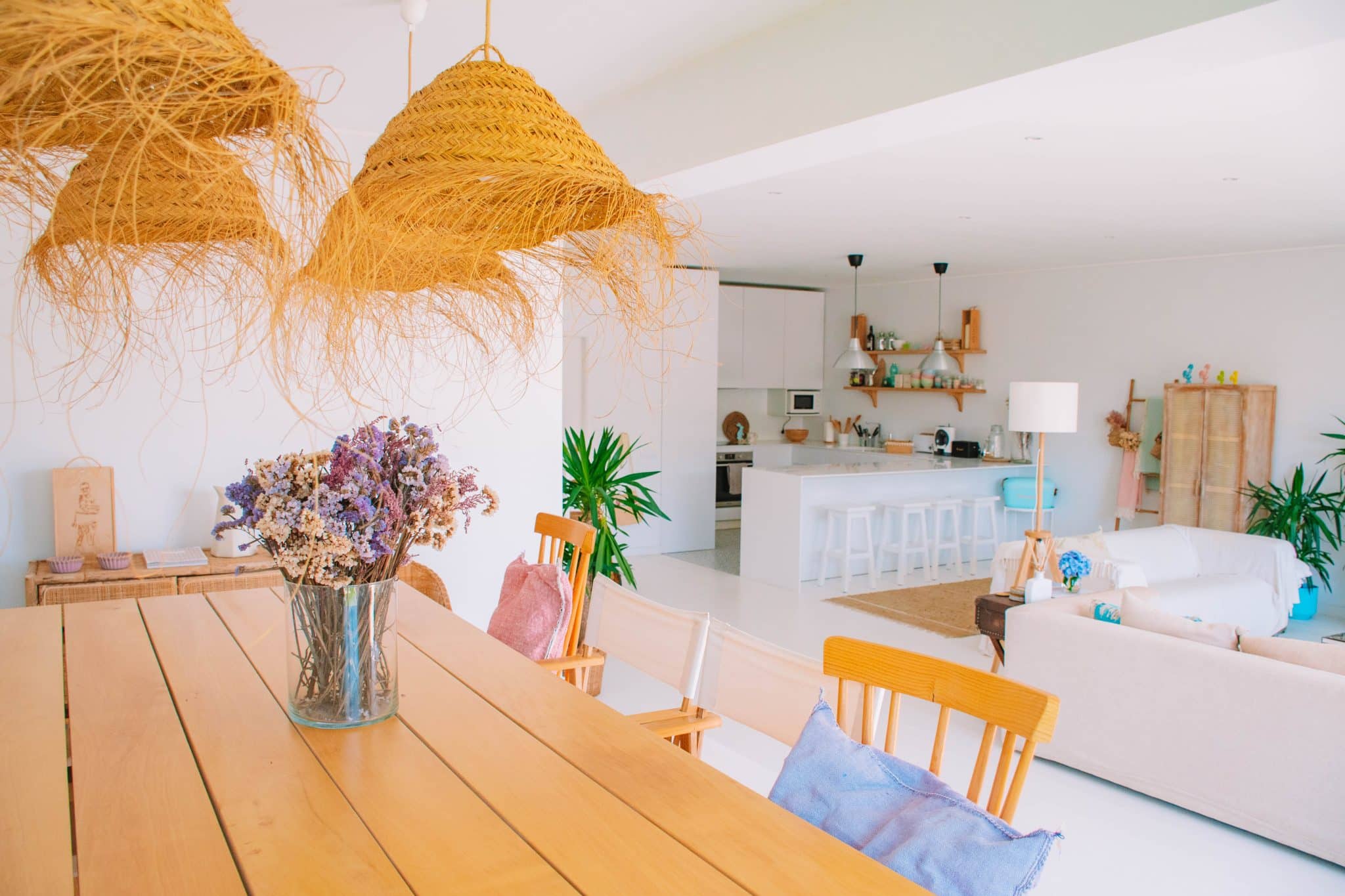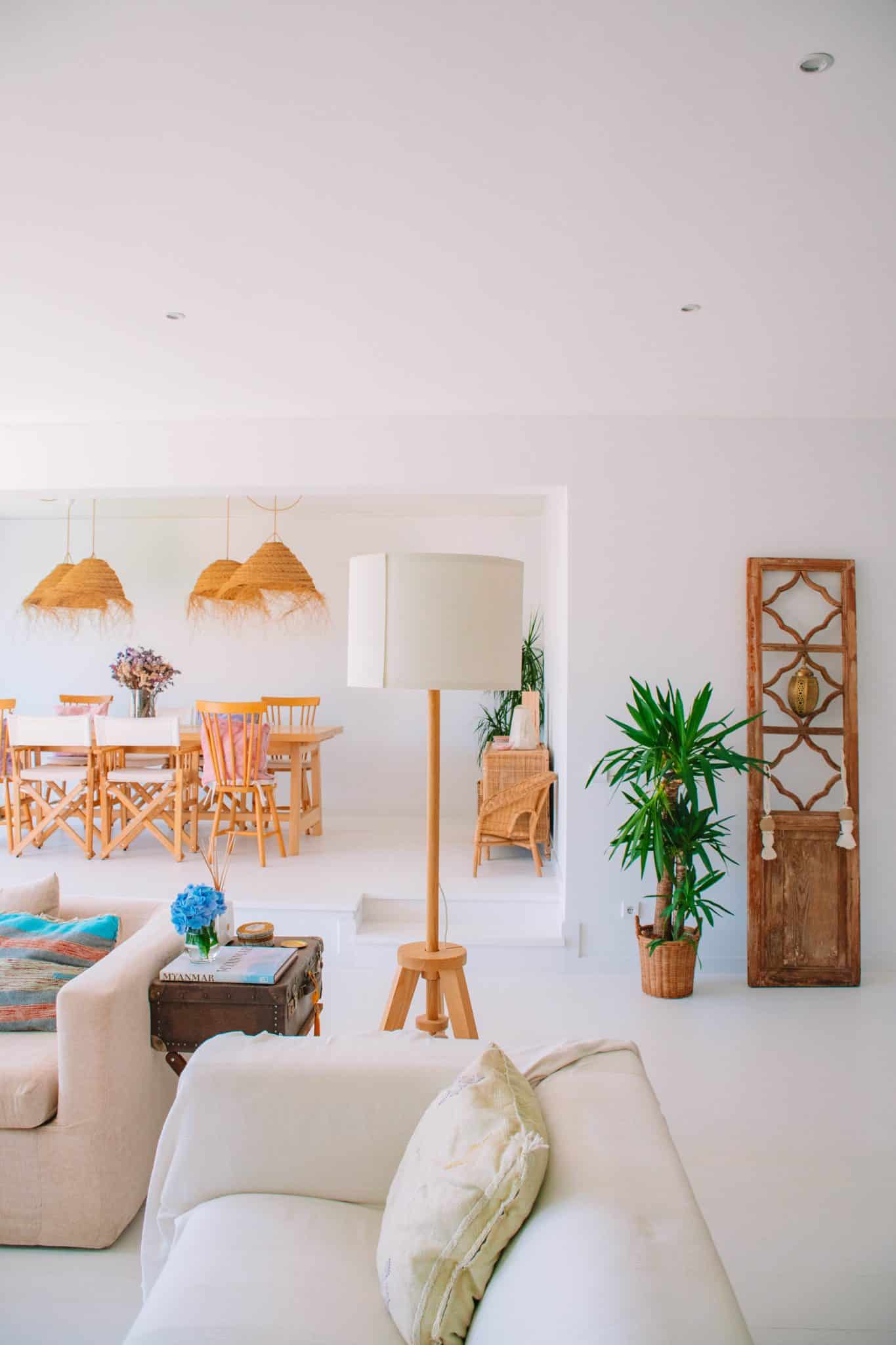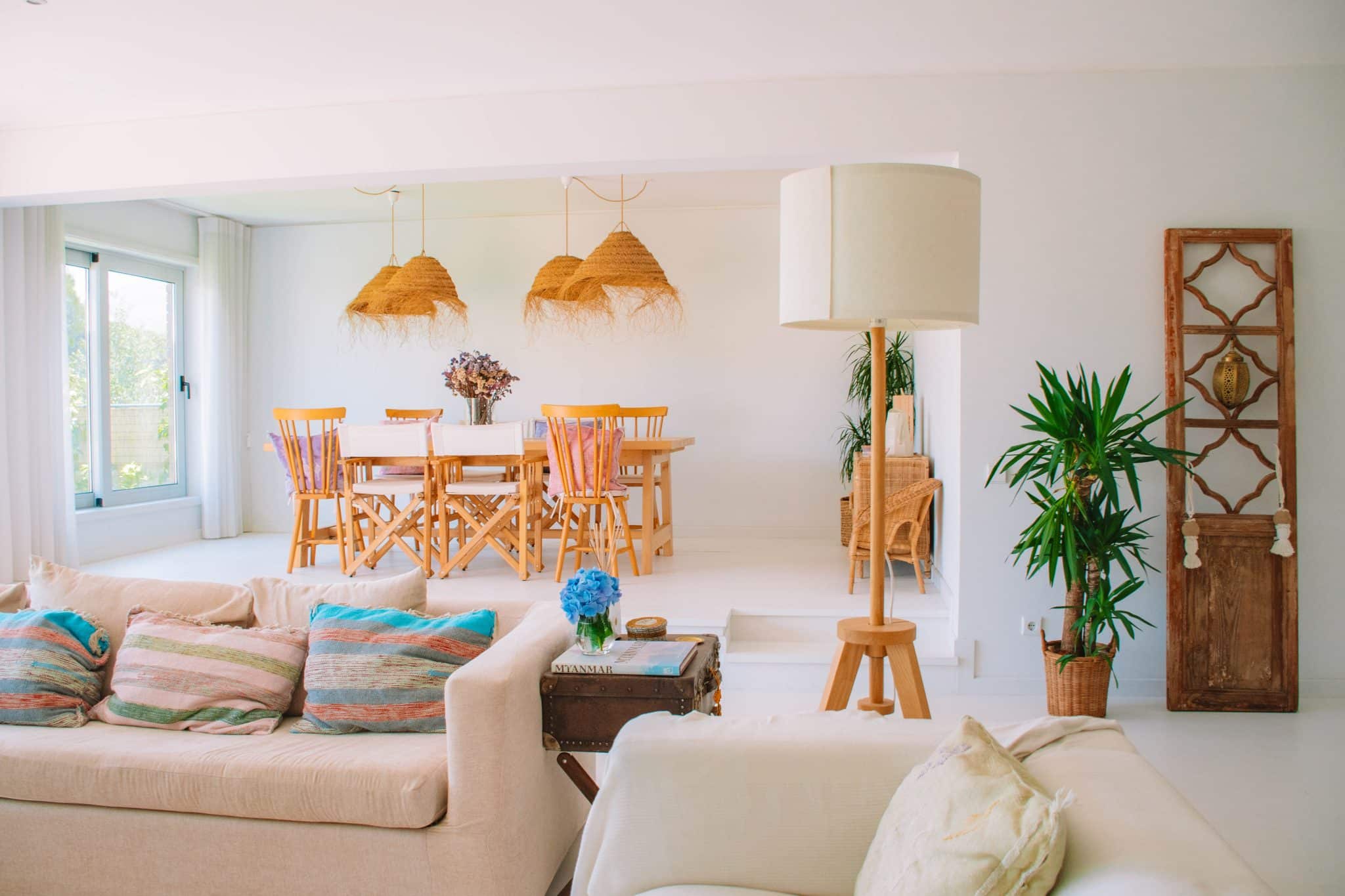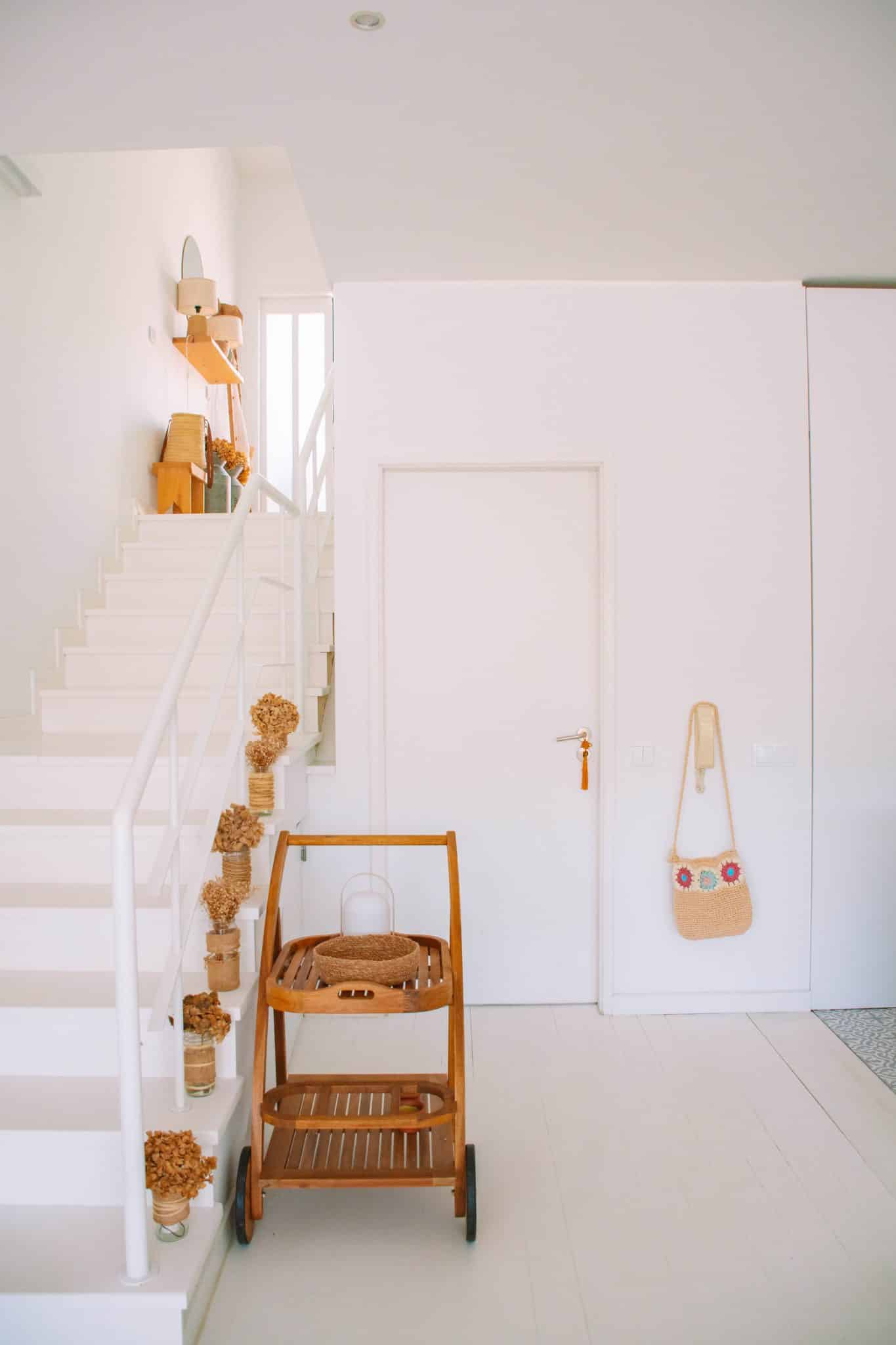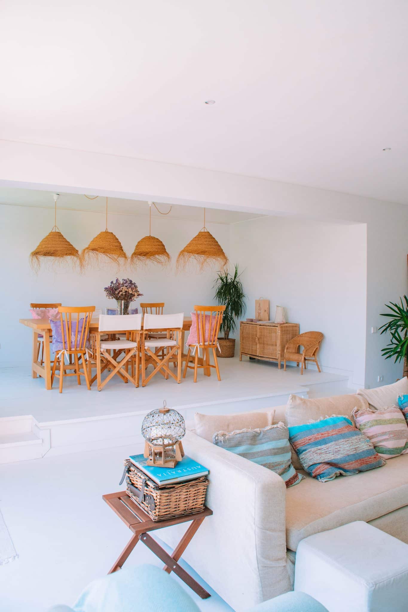 Toda branca – do chão ao tecto – a casa transmite uma sensação de paz, luz e harmonia. A decoração é uma fusão elegante entre o rústico e o moderno, com peças de design e objetos colecionados em viagens pelo mundo, conferindo-lhe um carácter verdadeiramente especial.