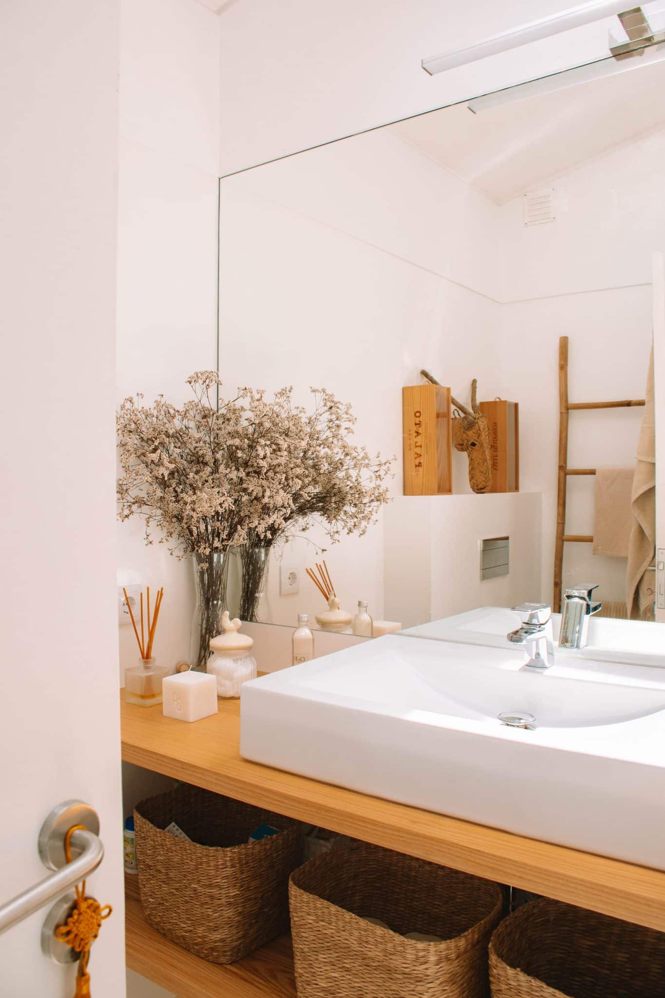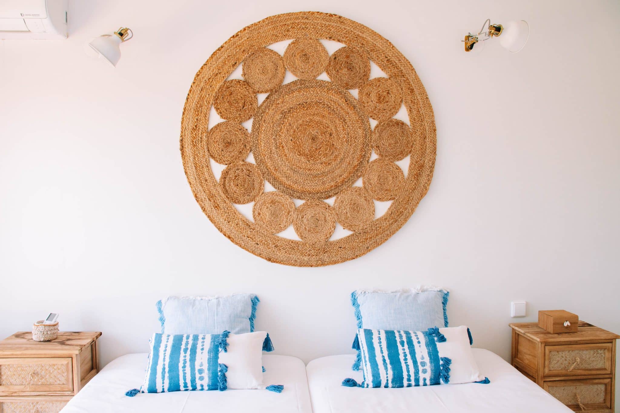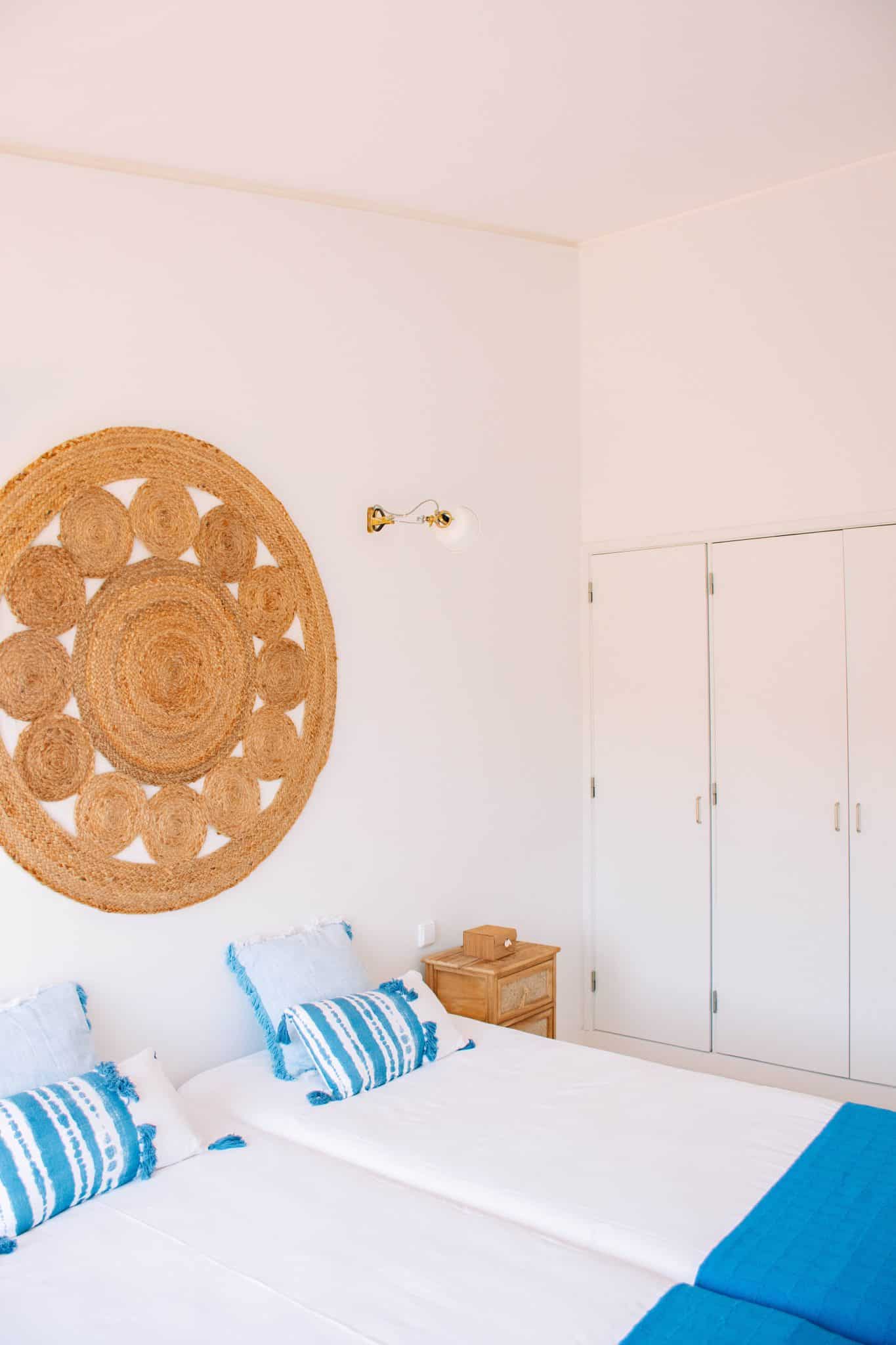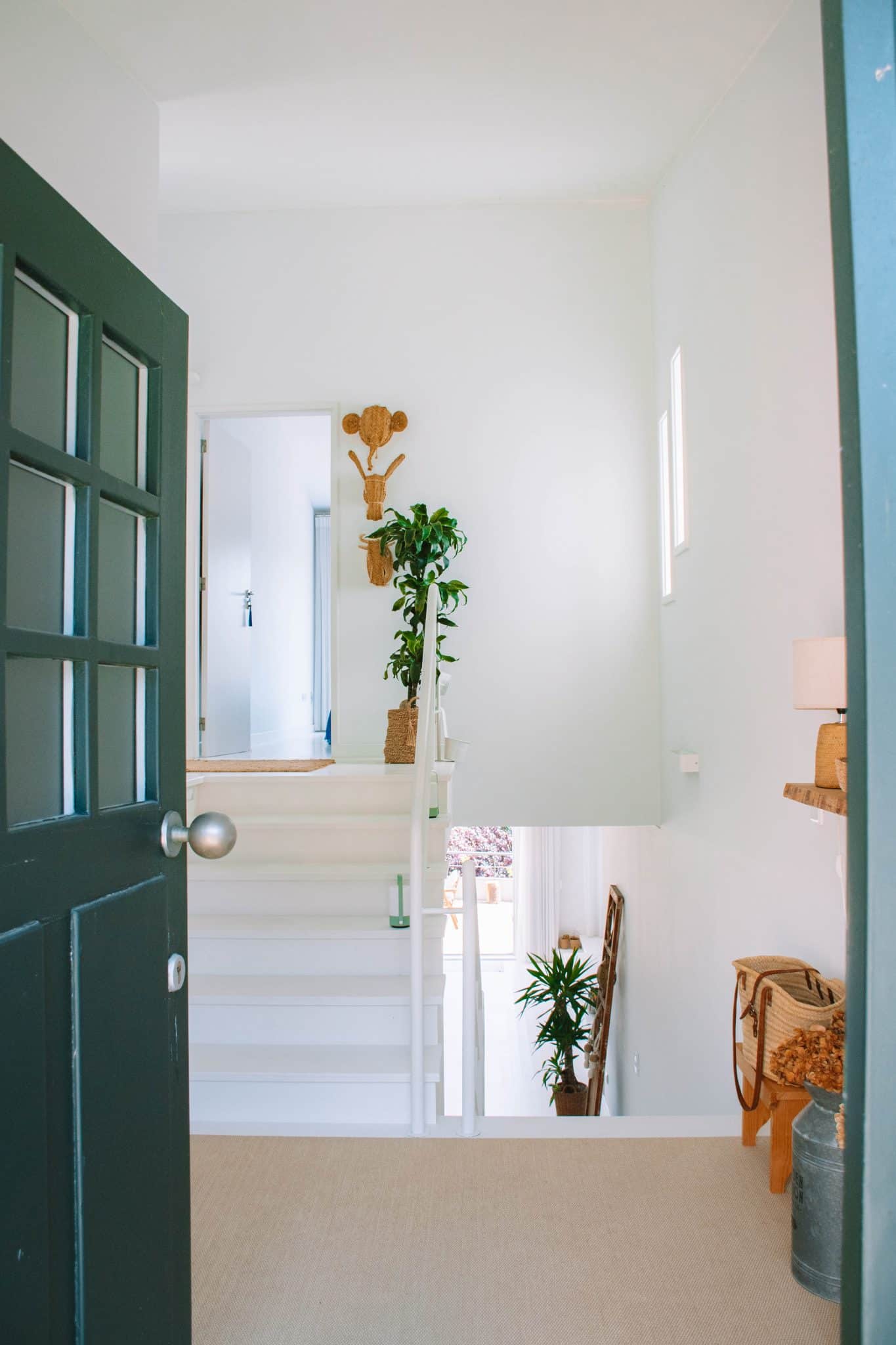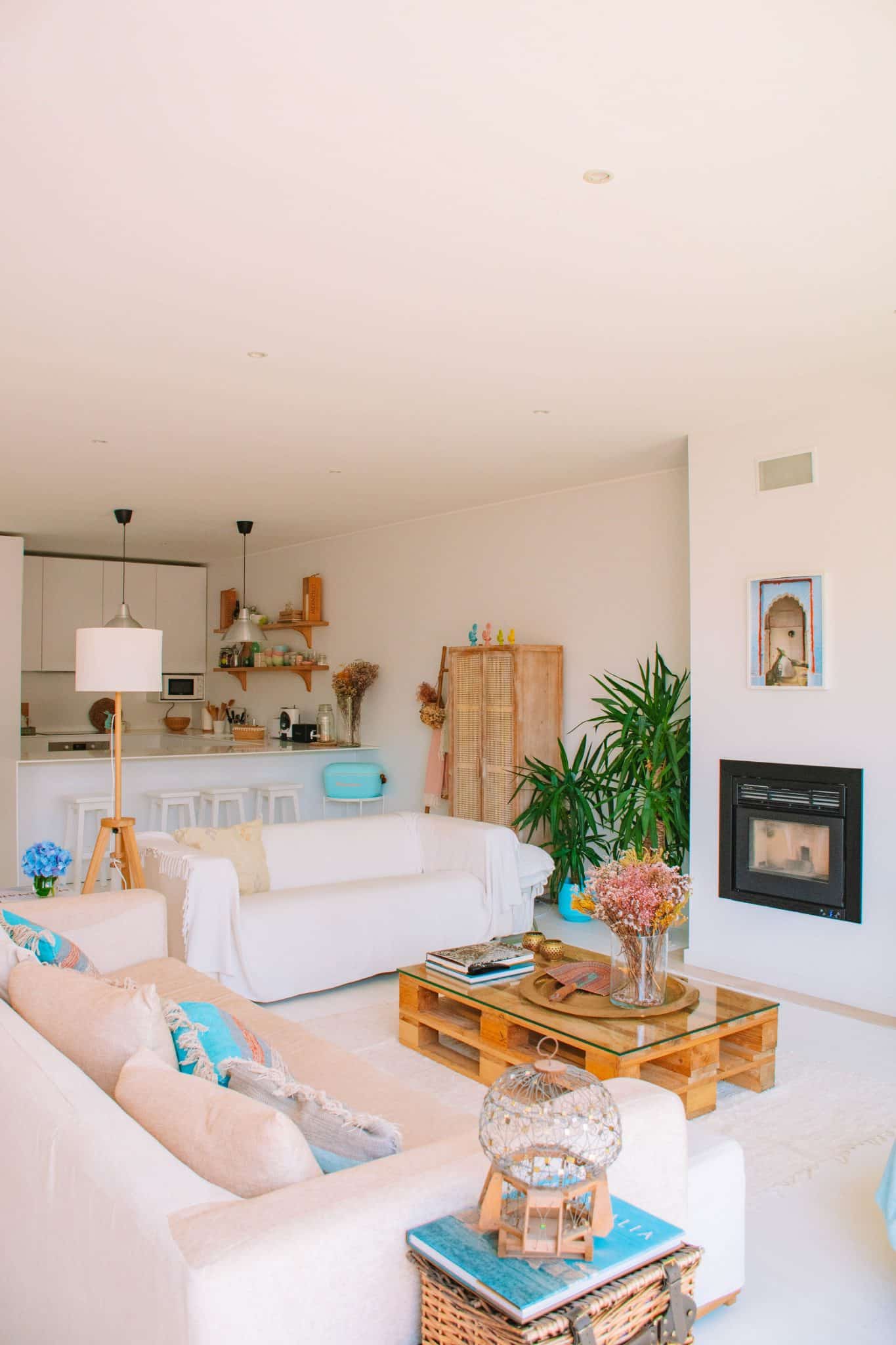 Toda branca – do chão ao tecto – a casa transmite uma sensação de paz, luz e harmonia. A decoração é uma fusão elegante entre o rústico e o moderno, com peças de design e objetos colecionados em viagens pelo mundo, conferindo-lhe um carácter verdadeiramente especial.