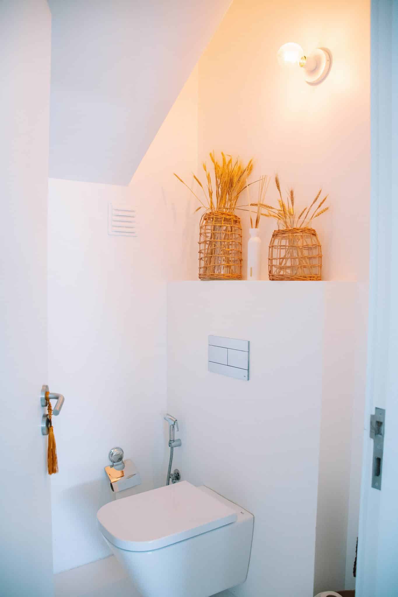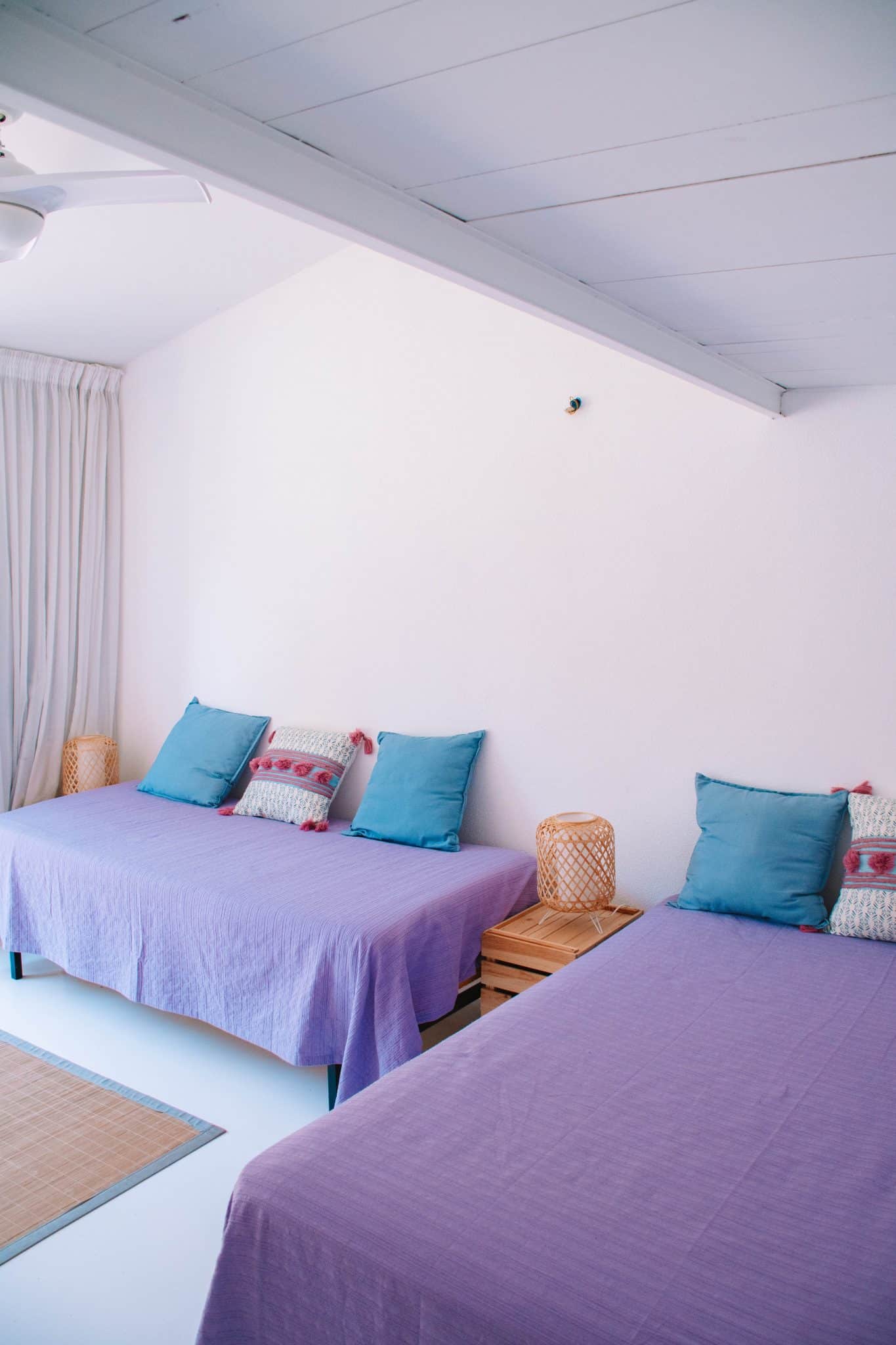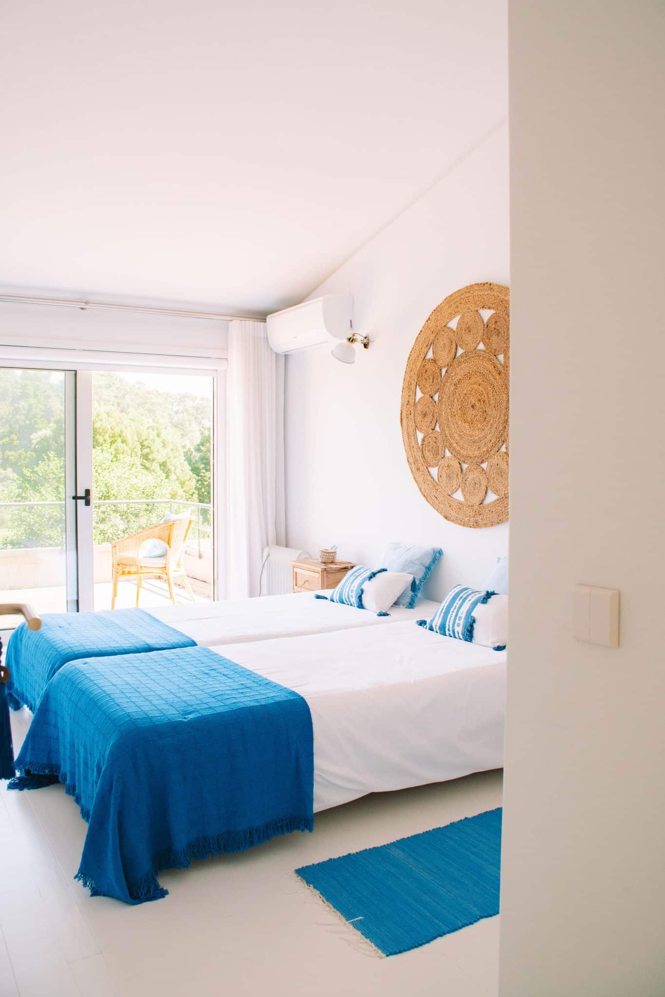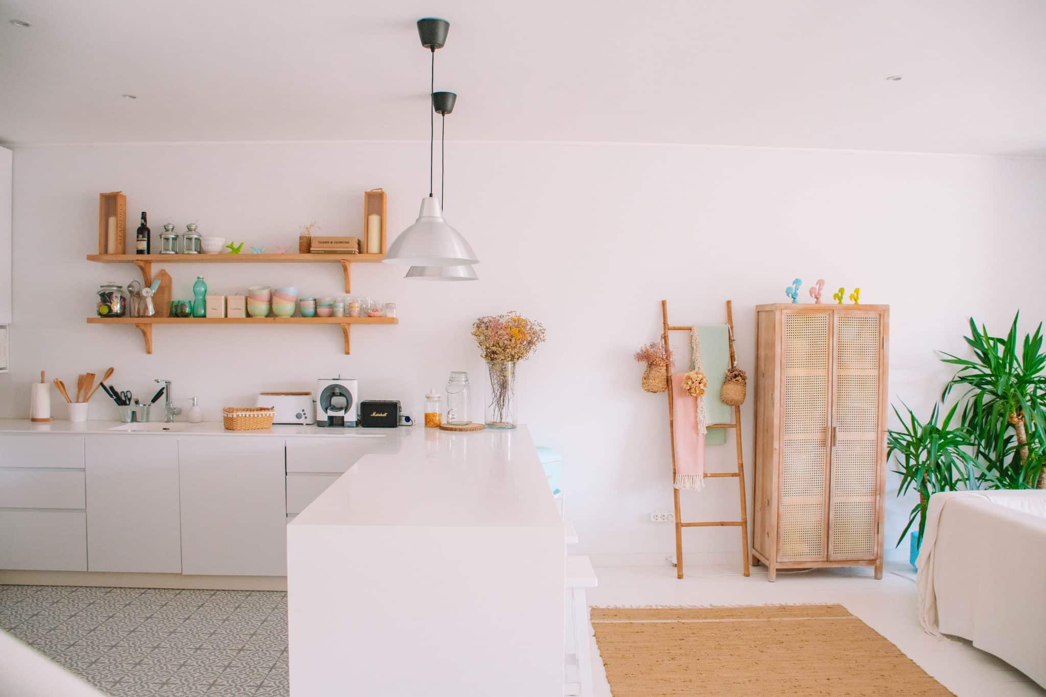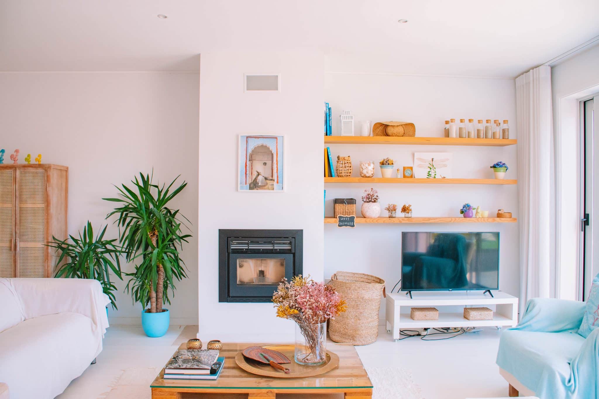 Toda branca – do chão ao tecto – a casa transmite uma sensação de paz, luz e harmonia. A decoração é uma fusão elegante entre o rústico e o moderno, com peças de design e objetos colecionados em viagens pelo mundo, conferindo-lhe um carácter verdadeiramente especial.